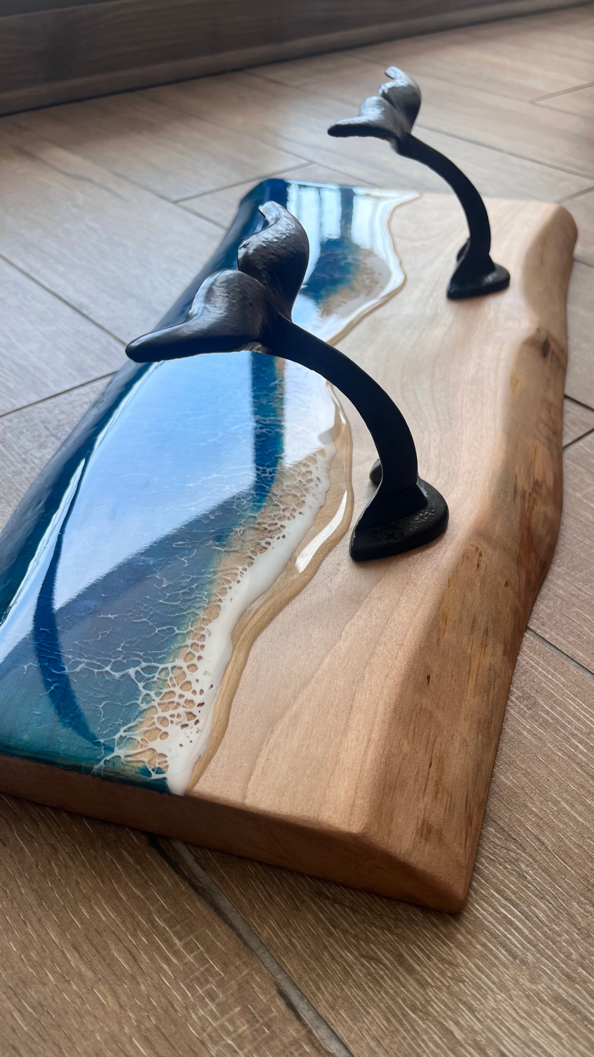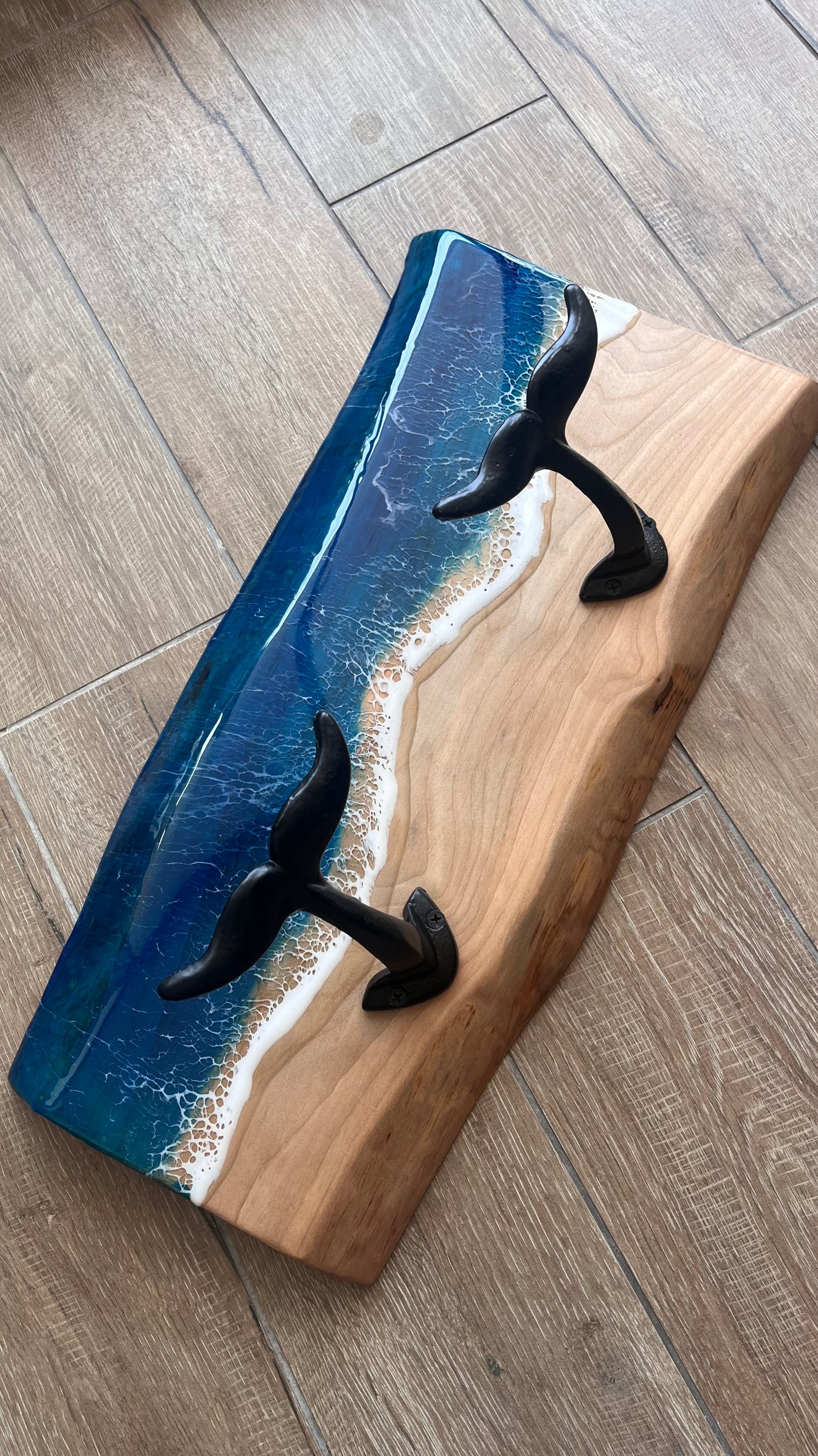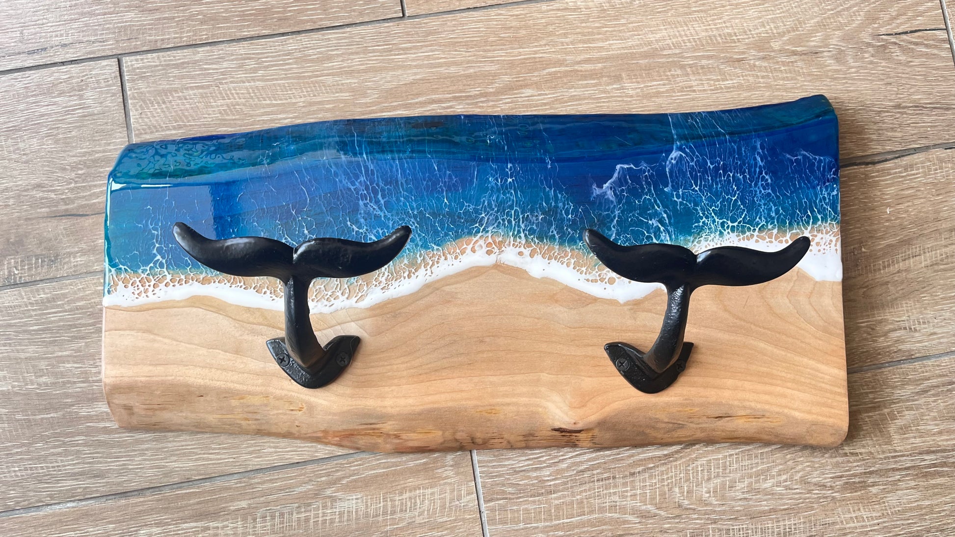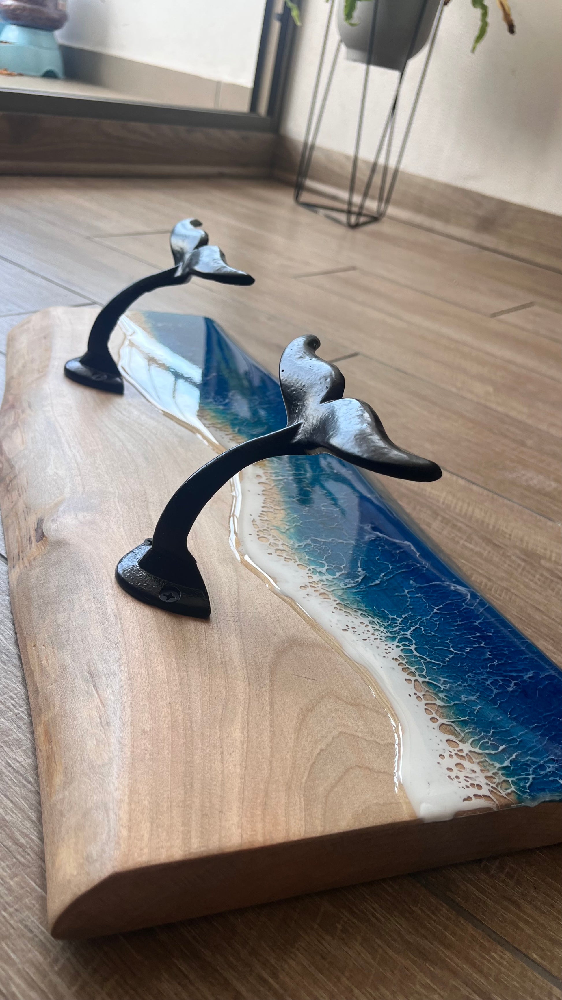 Este colgador, creado desde madera nativa y decorado con la técnica Ocean Art en resina epóxica, captura la esencia del océano en cada detalle. Las tonalidades azules y turquesas simulan olas cristalinas, mientras la forma de los colgadores cola de ballena rinde homenaje a la majestuosidad de la vida marina.