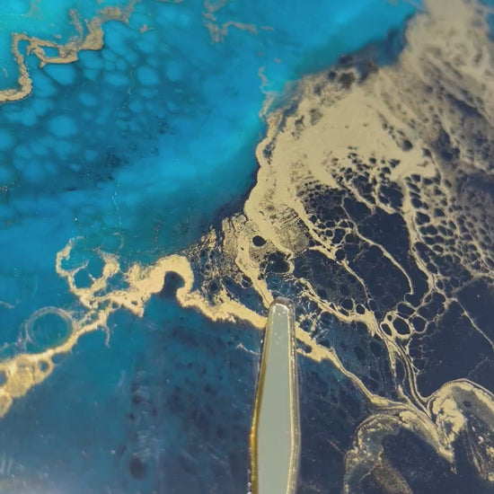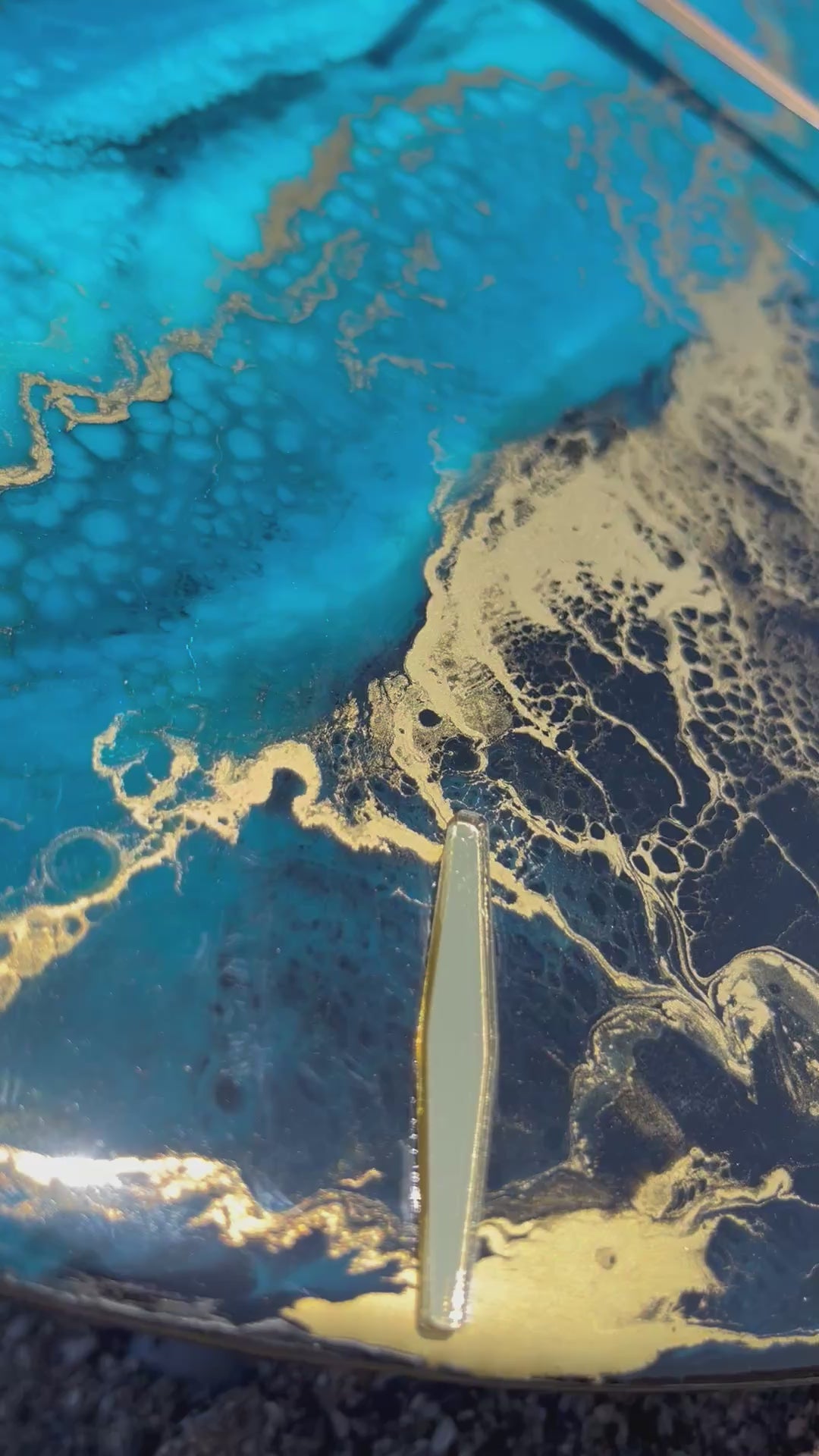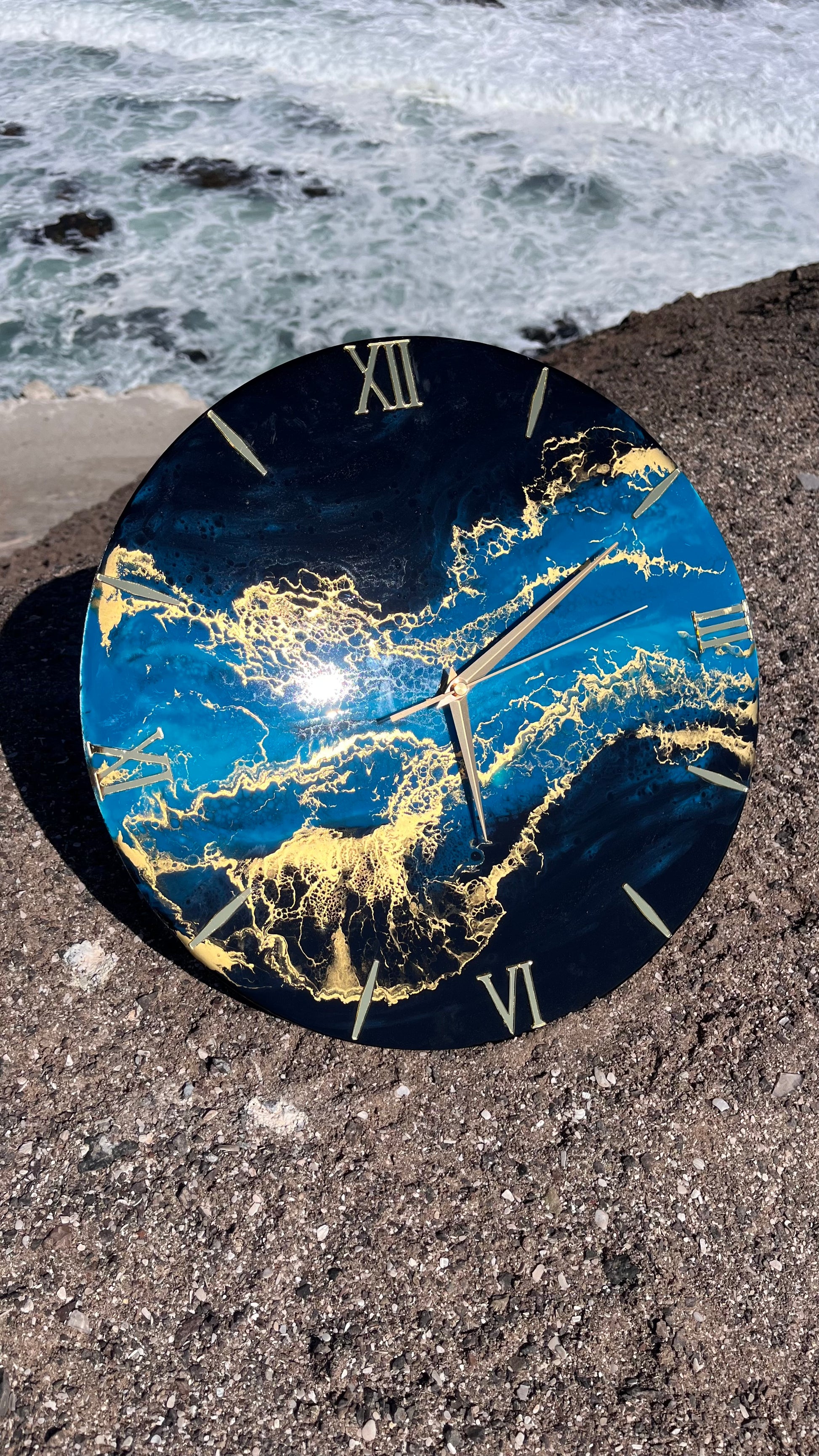 Los marcadores y minuteros dorados dan vida a esa mezcla perfecta de colores, donde las capas de resina se mezclan para dar ese hermoso efecto.