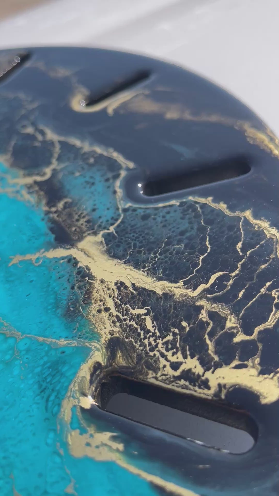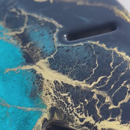 Un reloj de pared único, fabricado artesanalmente en resina epóxica, donde los tonos negro intenso, turquesa profundo y dorado se fusionan en una obra abstracta llena de movimiento y profundidad.